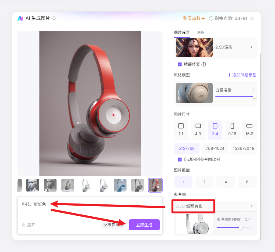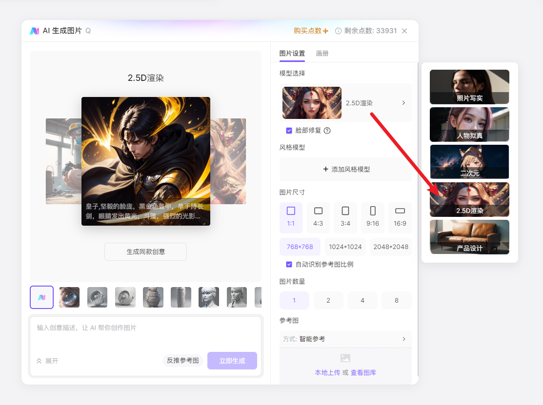 可生成气概各别的图片,这里我们想生成二次元气概动漫人物,此中取电商产物衬着图相关的模子为3D喷鼻水瓶衬着、白模衬着。我们能够点击下方的「添加气概模子」,能够点击案例图左上角的「创做同款」,点击即可添加,正在选定一个根本模子的环境下,